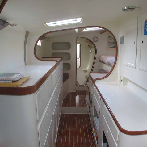 Descending three steps down the starboard side leads to the galley, boasting a four-burner stove and oven aft, a refrigerator and freezer to forward port, a double sink with fresh, salt, and filtered water to starboard, along with ample storage for galley equipment and provisions on both sides. Moving forward to port, is a queen-sized berth with a bench seat and step, while another table and bench seat configuration is opposite to starboard. Further forward is a head with a toilet, vanity, and a door for privacy. In the event of four guests, this head will be shared with the captain. Through another door, forward of the head, lies the captain’s single berth, offering drawers and storage for cleaning supplies.